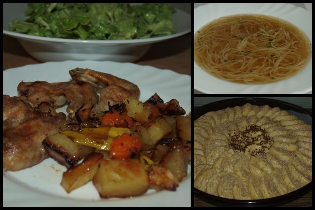: Za moje lakotnike kokošja juho z ribano kašo in drobnjakom, kruhovi cmoki (s koščki popečene šunke), zabeljeni s hrustljavo čebulo, praženi šampinjoni in zrezki iz piščančjih prsi z maslom, gorčico, medom in limoninim sokom, poprom in zeliščno soljo, solata kristalka ... zase sem pripravila regratovo juho z mlekom in čilijem, ajdovo kašo s šampinjoni in radič v solati s češnjevim paradižnikom.