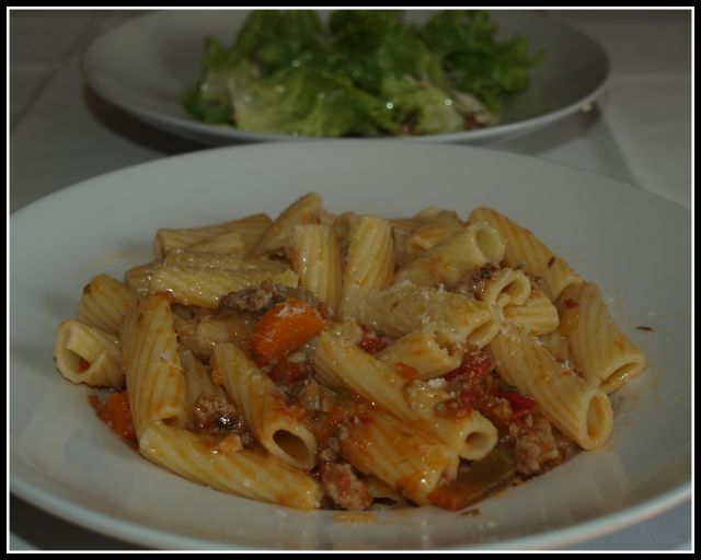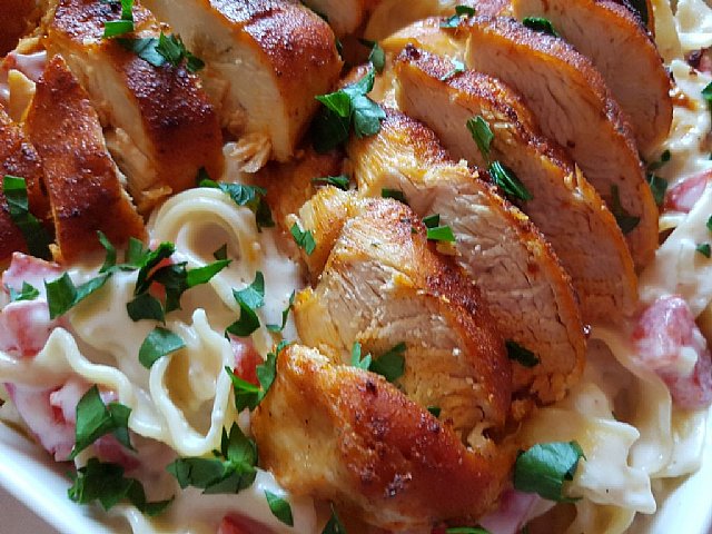 Piščančji file s testeninam v Alfredo omaki in zelena solata ....