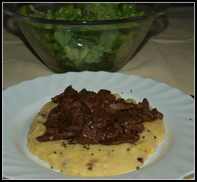 Pražena jetrca z želodčki, polenta z ocvirki, zelena solata:
