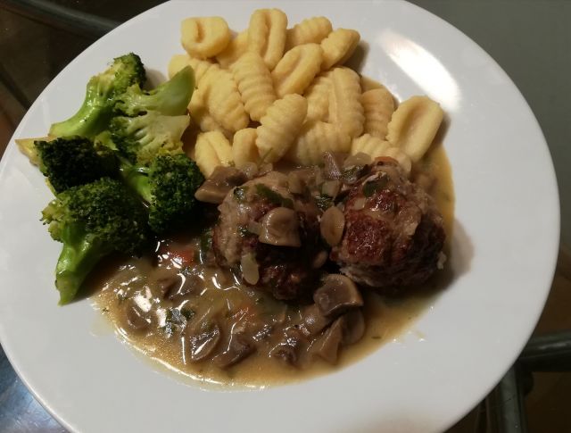 danes mesne kroglice v gobovi omaki, njoki in na pari kuhan brokoli