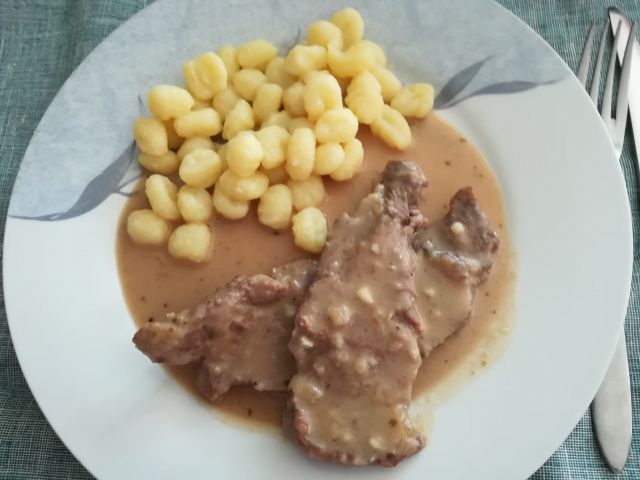 danes goveji zrezki v omaki, njoki in zelena solata