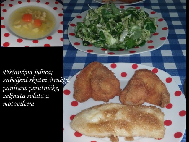 Danes mož pečenico in kislo zelje, kruh, jaz pečene kozice in lignje v domači solati, ajdov kruh. Sin pa je užival na pikniku pri prijatelju. Za jutri se kuha goveja juha- bo z zdrobovimi cmoki, zraven meso, krompir, domača solata.