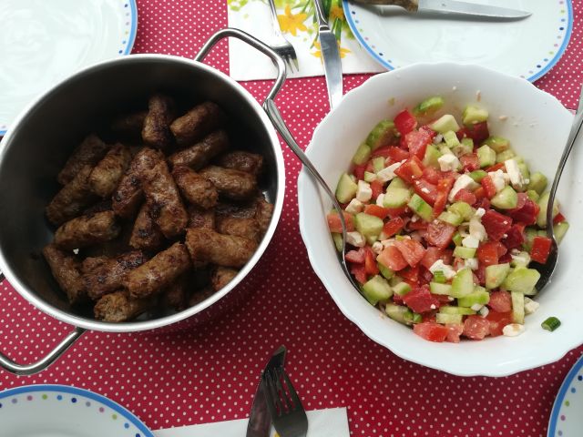 pečena orada, blitva s krompirjem, domača zelena solata. Za ne ljubiteljico rib ražnič.