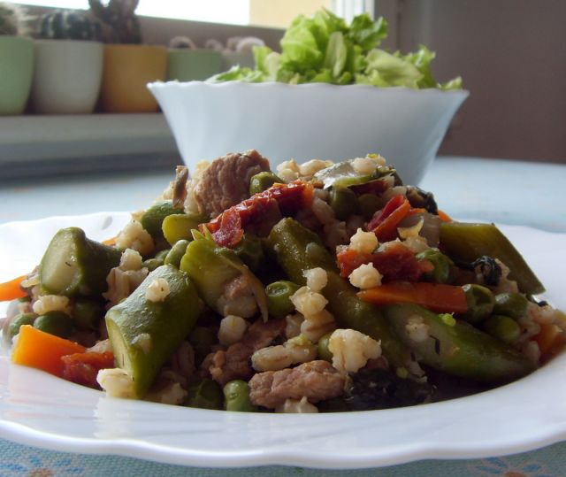 Danes in tudi včeraj porova kremna juha, včeraj pečen brancin in zelena solata s fižolom, danes pa še rižota s šparglji (po receptu iz baze), solata. Kako paše brezmesni dan! Mislim, moja boljša polovica je po dolgem času sama od sebe pristala na kosilo brez mesa. ![]()