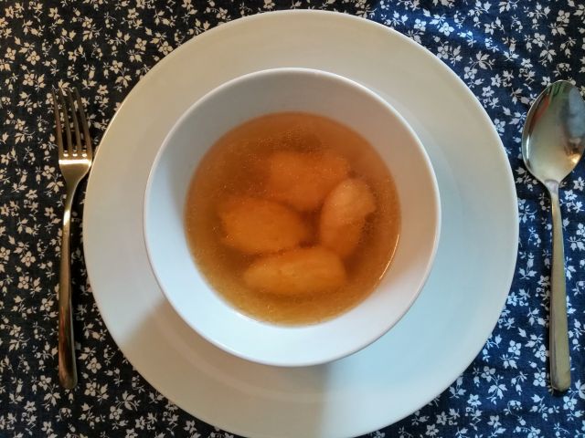 Goveja juha z zdrobovimi cmoki, pražen krompir, meso po dunajsko, berivka