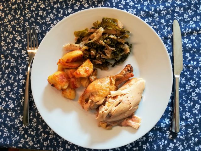 in pečen piščanec, pečen krompir, pražen ohrovt, zelena solata z motovilcem