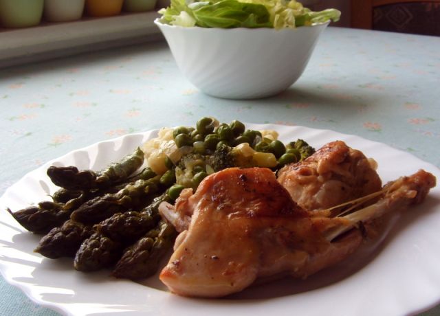 Zrezki v naravni omaki, popečen krompir, dušena zelenjava, ledenka solata z vrta, malinin zavitek