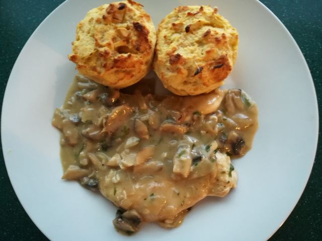 danes piščančji file v omaki iz šampinjonov, kruhovi muffini in berivka v solati