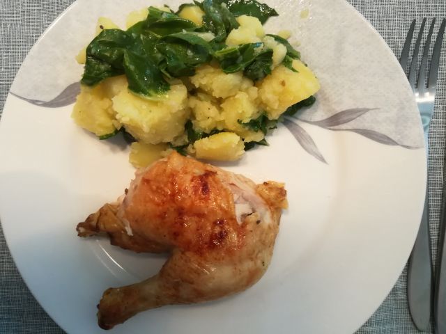 danes špinačna juha, pečen piščanec, krompir z blitvo, berivka in tržaški solatnik v solati