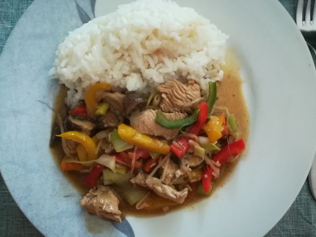 danes puranji koščki z zelenjavo po kitajsko, riž