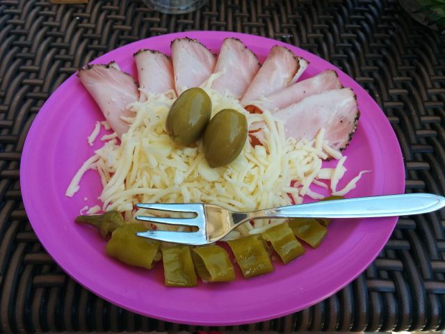 salamca, riban sir, ki mi je ostal, olive, feferon in mali strok česna, sledi pa še