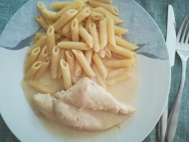 danes piščančji fileji v smetanovi omaki, makaroni in zelena solata
