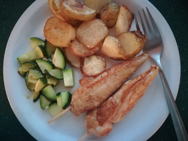 danes piščančja nabodala, pečen krompir in popečene bučke