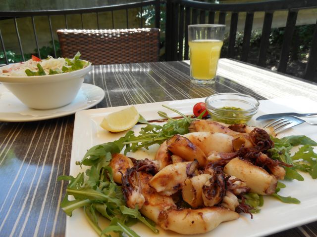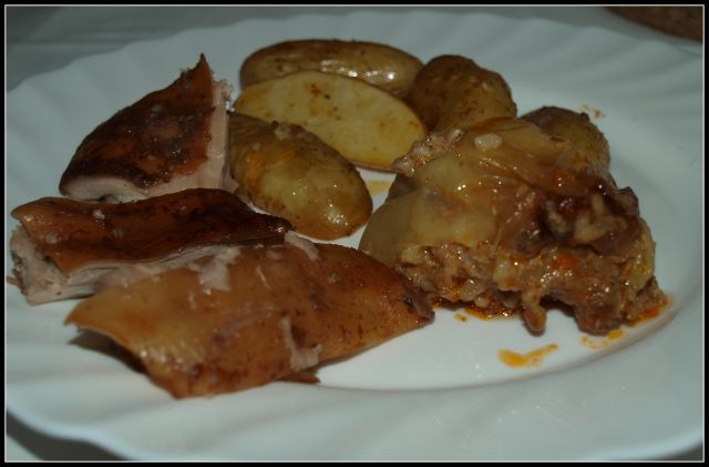 Filana paprika (ostanki); pečen kifeljčar, odojček (popotnica od včeraj), paradižnik solata; tri vrste tortic (prav tako popotnica od včeraj)