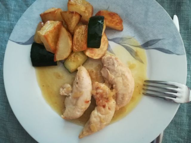 včeraj piščančji file pečen na čebuli, pečen krompir s bučko, radič v solati