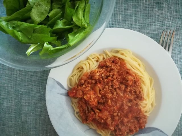 danes špageti, mesna omaka in radič v solati