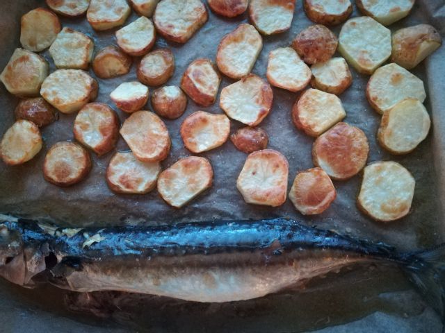 danes pečena skuša, pečen krompir in blitva s česnom