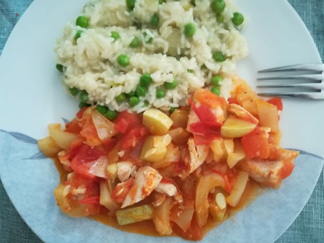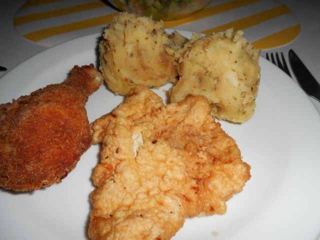 Včeraj; rizi bizi, zajček v naravni omaki, pečeni piščančji zrezki, paradižnikova solata in rdeča pesa, breskov kompot.