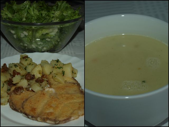 Bučna juhica; morski pes, zabeljen krompir (ker sem pozabila kupit blitvo), zelena solata: