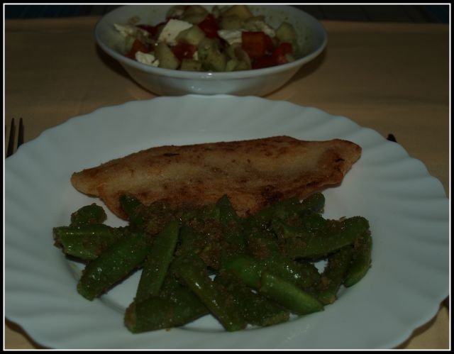 Stročji fižol na drobtinah, ribji file, šopska solata