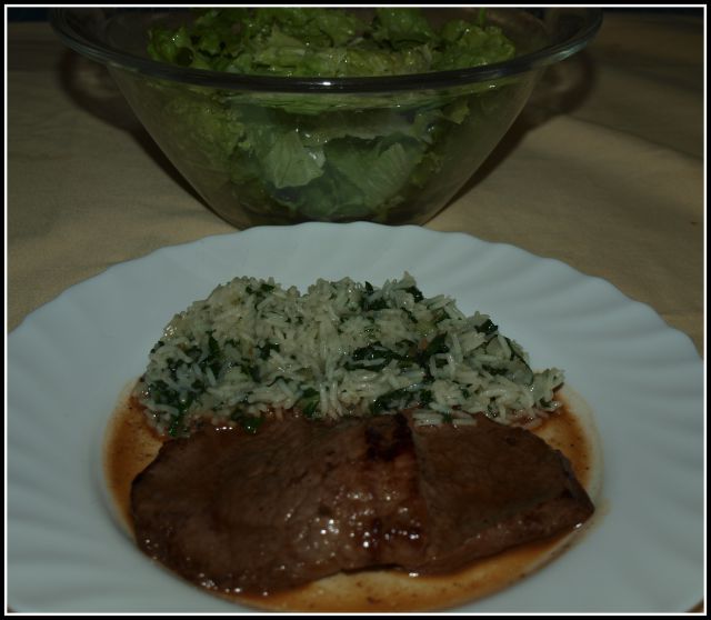 Basmati riž popražen na česnu in blitvi, dušen goveji zrezek v belem vinu, zelena solata;