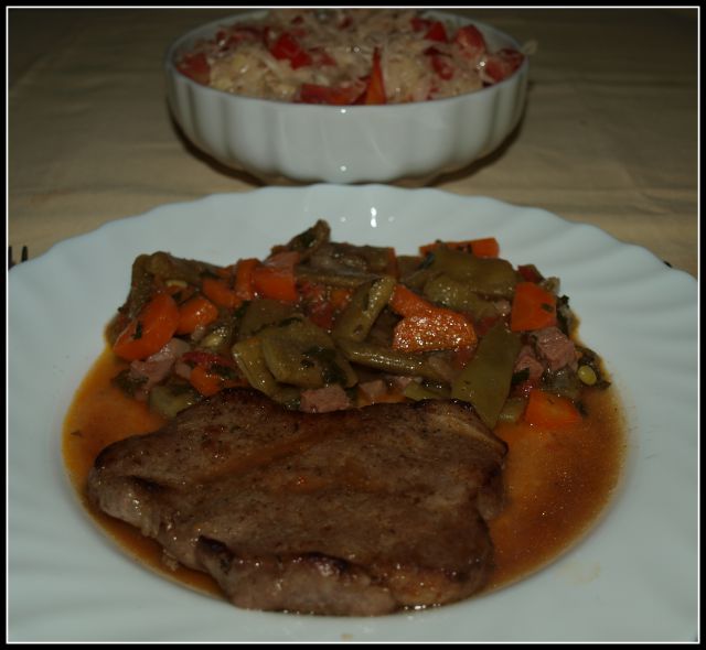 Stročji fižol, vratovina v vinu, zelje s paradižnikom