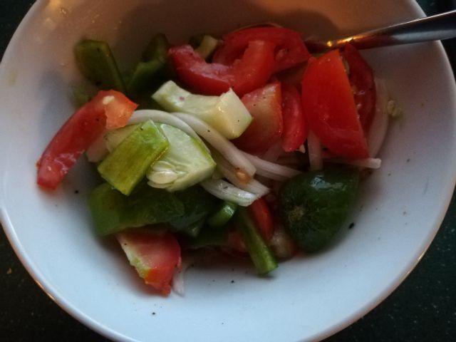 pire krompir, buče v omaki, zelena solata, paradižnik in paprika ![]()