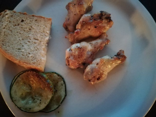 danes pečene perutničke, popečene bučke, kruh in solata iz kumare, paprike, čebule in paradižnika