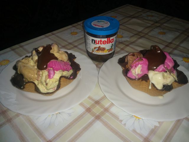 Nama sem naredila pa sladolec v (kupljenih) košaricah iz testa ter z Nutello na vrhu