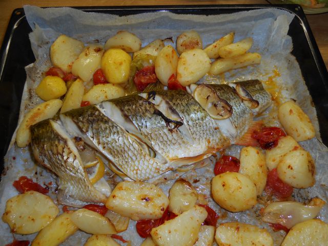 Včeraj pri naju: pečen krompir, riba in kumare v solati