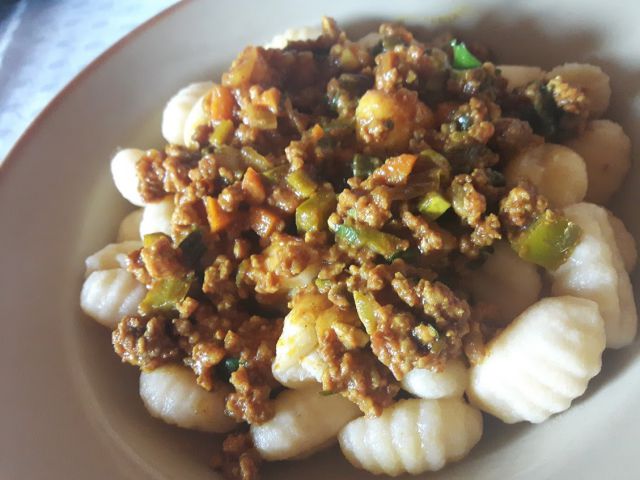 Njoki z mletim mesom in zelenjavo, brez veliko dodatne omake, zraven pa malce grenek zelen radiž z vrta