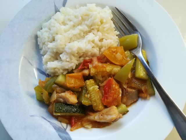 danes riž, piščančji koščki s papriko, paradižnikom in bučko