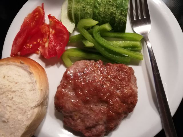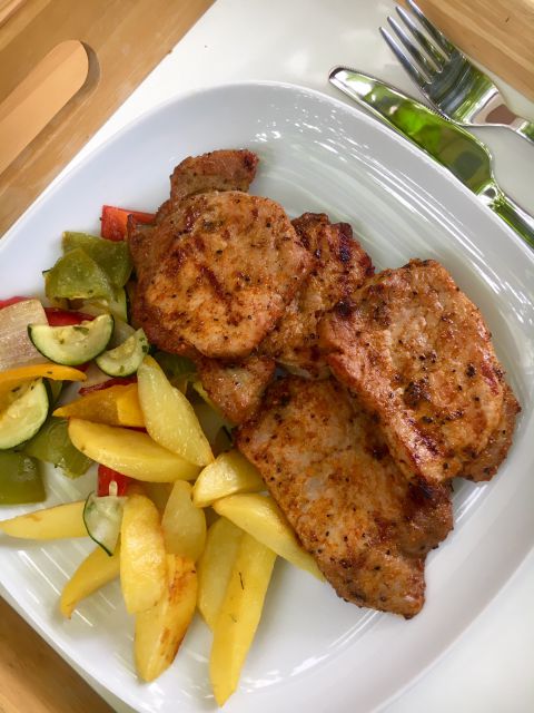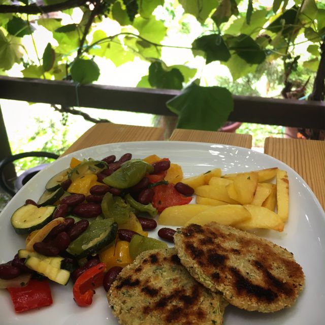 pečen krompir in zelenjava (tribarvna paprika, cukini, čebula ter za rastlinojedi del družine še rdeč fižol), kotleti in piščančji fileji na žaru, za rastlinojedi del družine bučni polpeti, kumarična solata