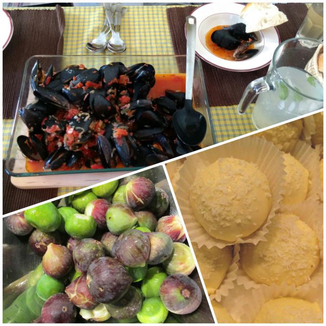 Vceraj pa po morsko, ce ze uzivava na taki klimi....se je splacalo prevozit tistih 500km do dol za takole povabilo; skoljke na rdece,orada in brancin v soli,blitva s krompirjem in za sladicko sveze narabutane fige,za neprestopnike pa piskotki z belo cokolado (no glede na to,da so bili presvercani cez dve meji