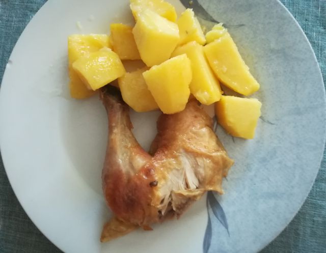 danes pečen piščanec, zabeljen krompir in zelena solata