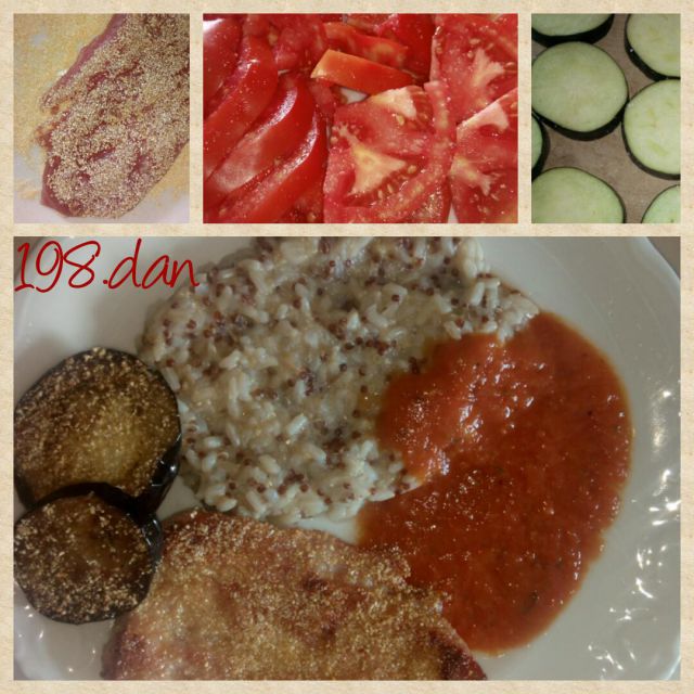 Jz sm pa danes puranje zrezke in malancane sam v polento povaljala in spekla, zraven pa skuhala tribarvni mix (kvinoja, rjavi riz in ajda) ter narezala paradiznik.