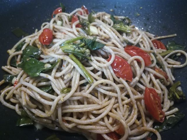 pirine špagete s česnom, čilijem, poganjki brokolija, češnjevim paradižnikom, mlado čebulo in listi špinače, oba zeleno solato.