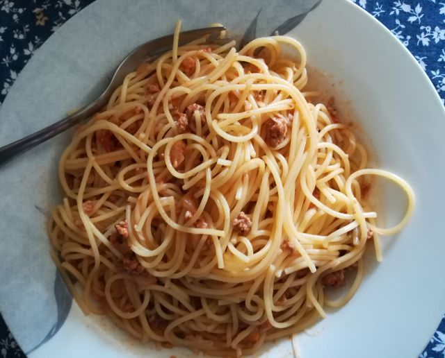 pri nas danes mesna omaka, špageti in motovilec z rukolo v solati
