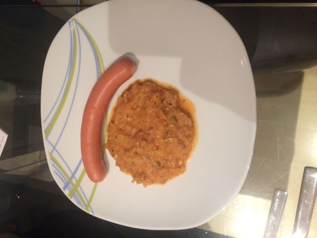 Vceraj murkin zos (kumaricna omaka slovensko) s krompirjem in hrenovko, danes bo paprikas.
