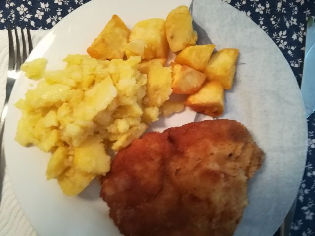 danes panirani piščančji zrezki, tenstan krompir, pečen krompir in zelena solata z radičem