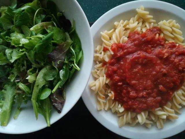 danes na hitro, testenine, kupljena boloneze omaka, mešana solata