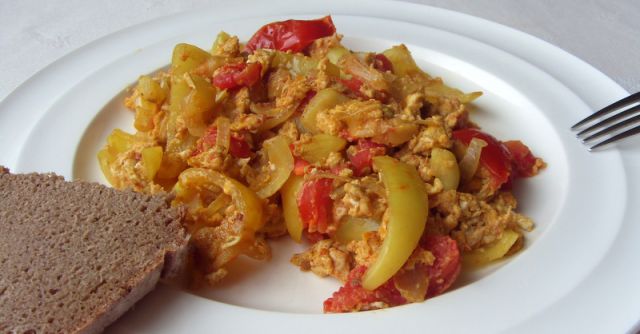 Danes je gorelo pod petami (uspešno pogašeno), zato na hitro umešana jajca s paradižnikom in papriko, karijem...