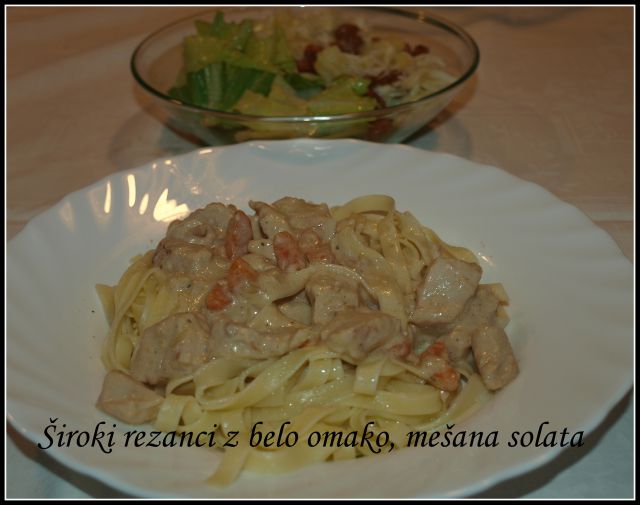 Midva sva imela danes široke, pisane rezance iz Lahovega mlina, pečenega lososa in mešano solato. Jutri bo pa nekaj iz dveh jurčkov. Želim si jih z jajci.