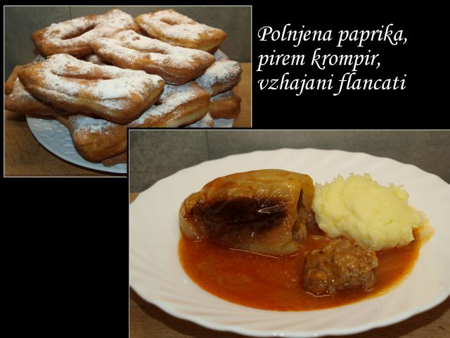 Danes za moja dva filana paprika iz zaloge, v kosih krompir, zame špinačni rezanci z jurčki in gamberi, za vse mešana solata