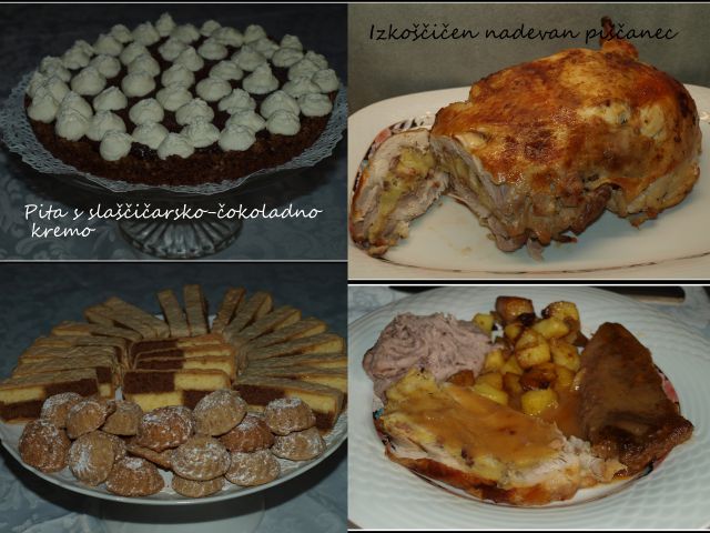 Goveja juhica z domačimi rezanci; matevž, goveji zrezki v čebulno-vinski omaki iz pečice; pečen izkoščičen in nadevan piščanec, pečen krompir; motovilec, zeleni in rdeč radič s krompirjem, zeljnata solata, pečena paprika s česnom; pita s slaščičarsko čokoladno kremo, šahovnica, piškotne potičke