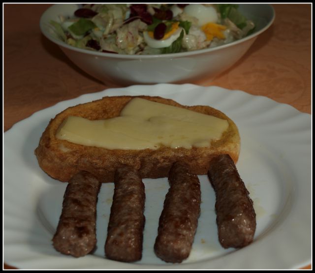 Popečen kruh s sirom, čevapčiči, zeleni in rdeči radič s fižolom, ocvirki in jajcem