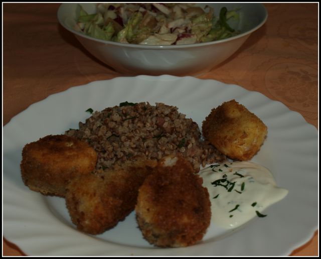 Ajdova kaša s slanino in čebulo, panirani oslič, jogurt-smetanova omaka; mešana solata (radič, pečena paprika s česnom, krompir z ocvirki, črna redkev)