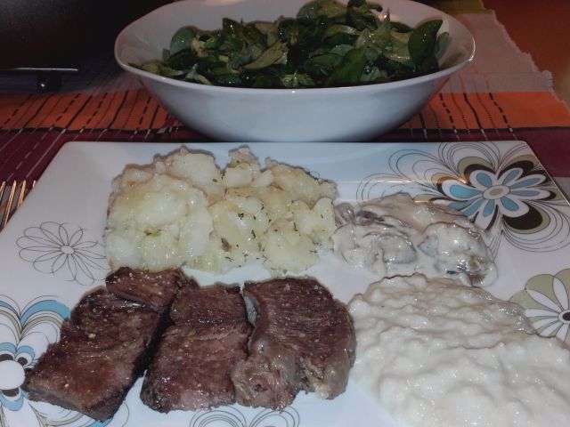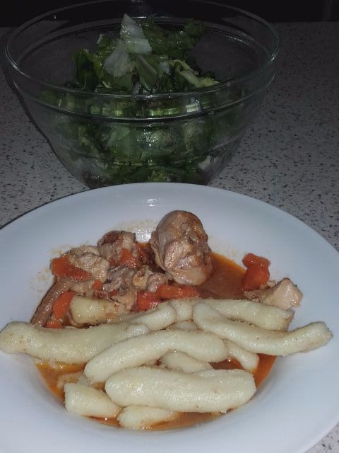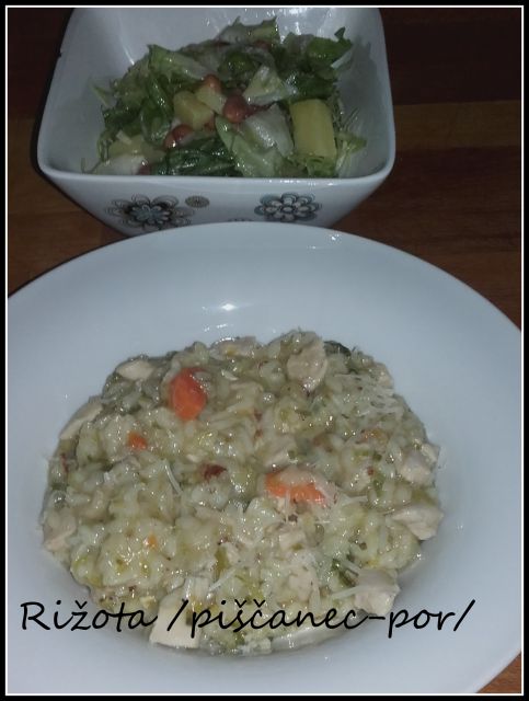 Juhe in mesa je ostalo toliko, da smo enako jedli še danes, le krompirja je zmanjkalo pa sem naredila riž z zelenjavo. Sinu pa sem pripravila zeleno soalto s češnjevim paradižnikom, krutoni in pečenim piščančjim filejev ter z začinjenim jogurotvim prelivom.