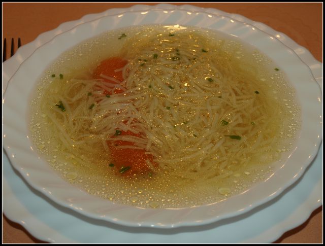 goveja juha, pražen krompir, pohani sv. zrezki, zelena solata, buhteljni