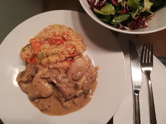 danes zelenjavni riž, pišč. zrezki v gobovi omaki in mešana solata